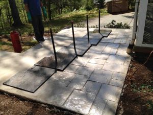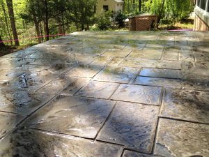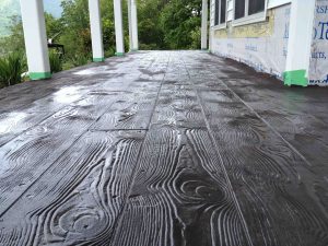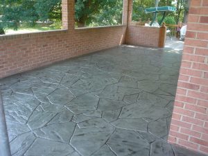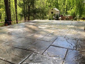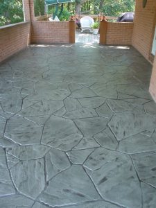 A stamped concrete overlay system duplicates the look of natural stone, slate and granite in deep relief patterns over existing concrete surfaces eliminating the hassle and expense of concrete replacement.